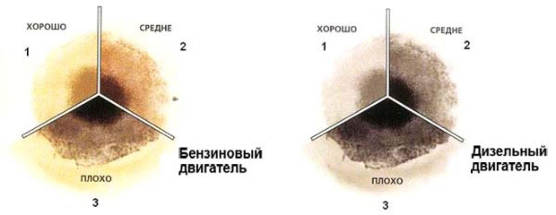 Сделать проверку вы можете, вытащив масляной щуп движка. Капните разок на бумажный листок и подождите четверть часа, чтобы масло пропиталось и сформировало наглядное пятнышко. После этого нужно сравнить полученное пятнышко с возможными вариантами на рисунке.